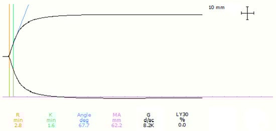 Thromboelastography values are represented with a graphic curve. The “x-axis” represents the time, while the “y-axis” represents the amplitude of the clot in millimetres (mm). The reaction time (R) is measured in minutes. It represents the time the clot takes to reach an amplitude of two mm and where fibrin polymers are first produced. Clot formation time (K) is also measured in minutes and it represents the time the clot takes to reach an amplitude of 20 mm. The α angle is measured in degrees and is the angle formed by the tangent to the curve at K time and y-axis; it represents the acceleration of clot formation and the kinetics of fibrin formation and cross-linkage. Maximal amplitude (MA) is the maximal amplitude reached by the clot, representing clot strength, and it depends on platelet number and fibrinogen concentration. Clot lysis (LY30%) is measured in minutes and it is the % of clot lysis at 30 min from the clot formation. The G-value is the shear elastic module and is measured in Dynes/cm2 and it is derived from the formula G = 5000 × MA/(100 − MA) [27,28].