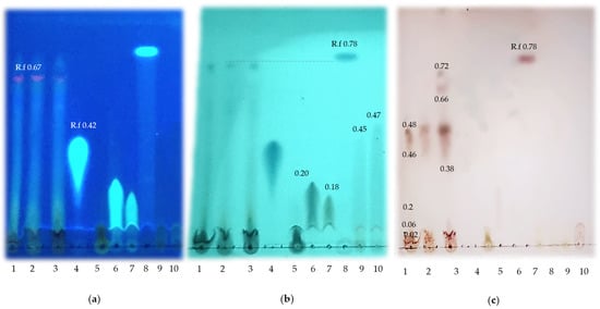 Qualitative characterization of GPM by thin layer chromatography. (a) UV (254 nm); (b) UV (365 nm); (c) Revealed plate. 1 (sample GPM), 2 (Sample dried GP); 3 (sample fresh GP); 4 (ferulic acid); 5 (GA); 6 (CGA), 7 (CA); 8 (RES); 9(CAT); 10 (EC). R.f (Retard factor).
