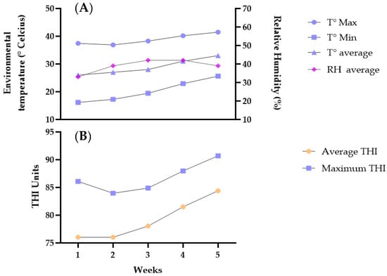 Environmental temperature and relative humidity: Maximum (T° Max), minimum (T° Min), and average temperature (T° average); Relative humidity average (RH average) (A). Temperature-Humidity index units (THI), Average THI and maximum THI (B).