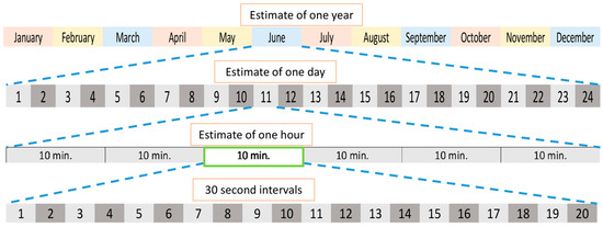 Data were collected through web cameras from December 2020 to November 2021 for all pandas except for the mother and cub. The mother was observed from December 2020 to March 2022, and her cub was observed from March 2021 to March 2022. The cub was aged 6 months when his observations began, providing an opportunity for a case study of how circadian rhythms develop in a cub. Focal sampling was completed for each giant panda using one 10 min sessions with 30 s intervals in each hour to gain an estimate of the behavior in that hour. Each month, data collection began on the 10th day and continued through the end of the month until one daylight or one 24 h cycle was recorded (dependent on the night vision of the camera) for each panda. Observations were performed in real time. Observers were assigned a maximum of 5 consecutive hours of observations, completing a maximum of three 10 min sessions with a minimum of 30 min rest each hour. Observers would determine which pandas needed a session completed in the hour and scan the cameras until they found a panda in view and would complete the 10 min session for the panda in view. Observers were trained to observe all pandas except for the mother and cub, which only the lead investigator observed. In addition, only the lead investigator had access to cameras at Zoo D, and therefore, these pandas were also only observed by the lead investigator. Between all 13 pandas, a total of 2592 ten-minute sessions (432 h) were completed and used for analysis. A graphical representation of the sampling method can be seen in Figure 1.