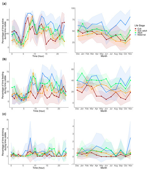 Circadian and circannual cycles of activity (a), feeding (b), and drinking (c) by life stage (cub, n = 1 for 24 h; subadult, n = 5, 3 for 24 h, 2 for daylight; adult, n = 6, 2 for 24 h, 4 for daylight; maternal, n = 1 for 24 h). Behaviors are displayed as estimated percentages of time active/displaying behavior while in sight, controlling for time out-of-sight, and are averaged by hour (circadian) or month (circannual). The black dotted line represents the mean across all individuals. Scales are not standardized between circadian and circannual graphs. The shaded regions are the 95% confidence intervals for the activity.