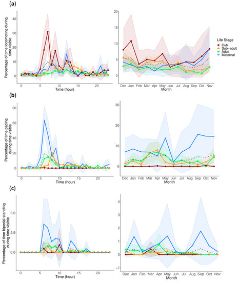 Circadian and circannual cycles of locomotion (a), pacing (b), and bipedal standing (c) across life stages (cub, n = 1 for 24 h; subadult, n = 5, 3 for 24 h, 2 for daylight hours; adult, n = 6, 2 for 24 h, 4 for daylight; maternal, n = 1 for 24 h). Behaviors are displayed as estimated percentages of time displaying behavior while in sight, controlling for time out-of-sight, and are averaged by hour (circadian) or month (circannual). The black dotted line represents the mean across all individuals. Scales are not standardized between circadian and circannual graphs. The shaded regions are the 95% confidence intervals for the activity.