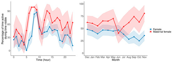 Circadian and circannual cycles of activity between the females (n = 5, 2 for 24 h, 3 for daylight) and the mother (n = 1 for 24 h). Behaviors are displayed as estimated percentages of time active while in sight, controlling for time out-of-sight, and are averaged by hour (circadian) or month (circannual). Scales are not standardized between circadian and circannual graphs. The shaded regions are the 95% confidence intervals for the activity.