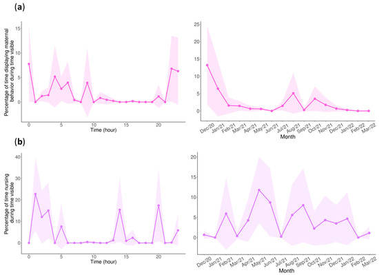 Circadian and circannual cycles of non-nursing maternal behavior (a) and nursing (b) for mother and cub. Behaviors are displayed as estimated percentages of time displaying behavior while in sight, controlling for time out-of-sight, and are averaged by hour (circadian) or month (circannual). Scales are not standardized between circadian and circannual graphs. The shaded regions are the 95% confidence intervals for the activity. Data are averaged between mother and cub.