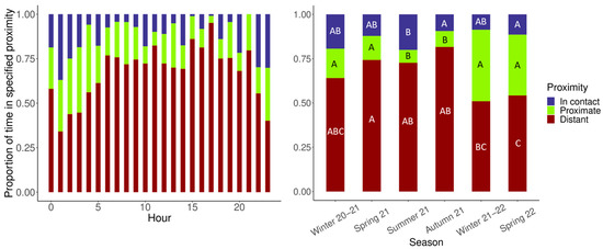 Proximity (in contact, blue; proximate, green; distant, red) of mother and cub displayed as estimated proportions of time by hour and by season. The letters within the proximity categories represent significance. Within each proximity category, different letters represent a significant difference between seasons for that proximity. Seasons that share any letter for a proximity category are not significantly different. Time when mother and cub were separated by zookeepers was excluded so that only proximity when mother and cub had a choice is displayed. Therefore, proportions of time are extended to 1 excluding keeper separation, which are only displayed during working hours of keepers.