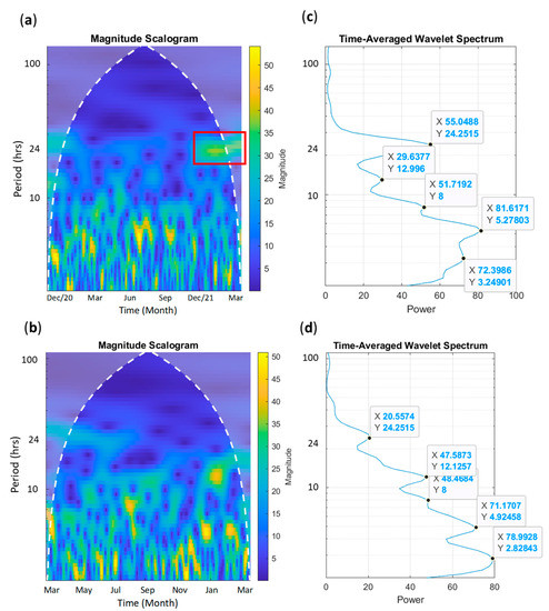 Continuous wavelet transform analysis of mother (a) and cub (b) overall activity. The x-axis represents the time in months across the observation period. Therefore, the mother has three more months of observations than the cub at the start. The y-axis is the period length in hours; periods above 24 h do not have real-world equivalents given our sampling method. The magnitude is represented with color. The red square in the mother’s wavelet highlights when her 24 h period of activity was more consistent. Time-averaged wavelet spectrums are also presented for mother (c) and cub (d). These graphs represent the average magnitude of period lengths across the observation period. The x-axis is the power (magnitude over time), and the y-axis is the period length, which equates to the period lengths in the wavelet.