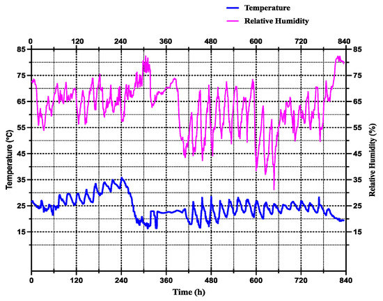 Variable temperatures and relative humidity were recorded based on the meteorologic conditions occurring in Hunan Province, China, using a GPS temperature and moisture data logger (GPS-6, Elitech Co., Ltd., Jiangsu, China) in the months of September and October 2022. The blue line represented the average daily fluctuating temperatures, while the purple one symbolized the average daily fluctuating relative humidity.