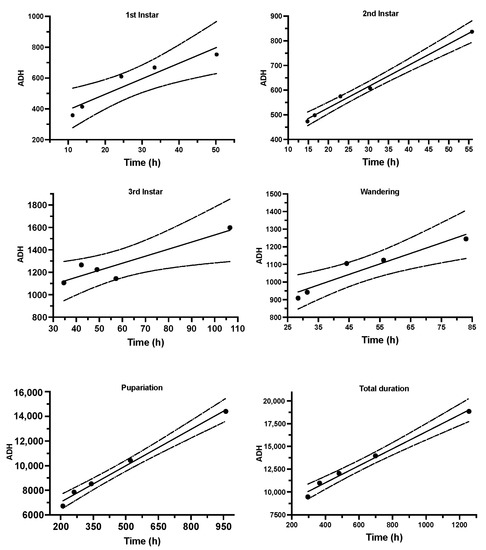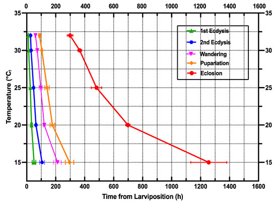 The isomorphen diagram was designed based on the time of all developmental phases from larviposition to adult emergence (x-axis) vs. different fixed temperatures (y-axis), where each line characterizes larval body changes, and the distances between lines describe the developmental stages [69]. An increase in temperature from 15 to 32 °C caused the time between each growth stage (first ecdysis, second ecdysis, wandering, pupation, and eclosion) to shrink and the distances between lines to decrease (Figure 2).