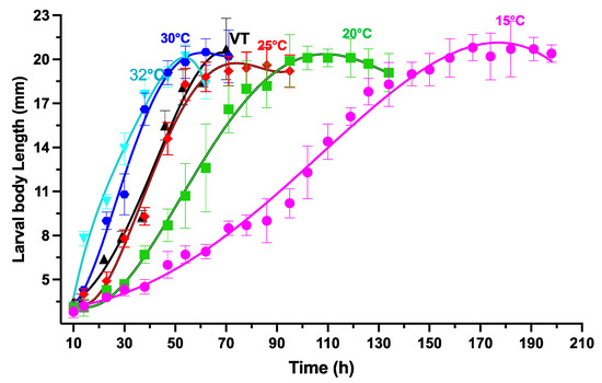 Variations in larval body length of S. crassipalpis over time (h) after larviposition at diverse fixed temperatures. The vertical bars symbolize the standard deviation.