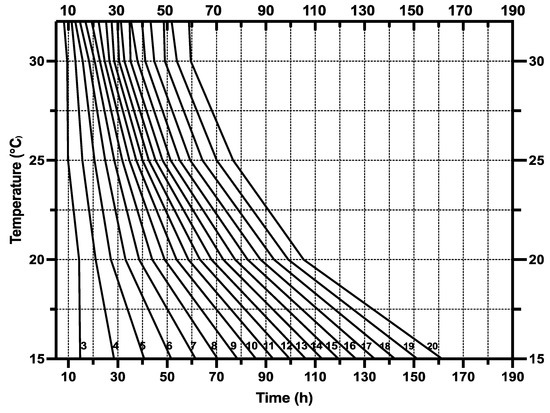 Isomegalen graph of S. crassipalpis larvae from larviposition to peak feeding phase. Time (h) was charted against temperature, and each line corresponds to the developmental larval length of 3–20 mm, with size indicated by the number at the lower left of each contour.