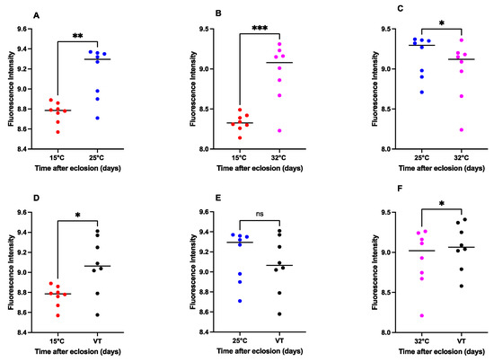 Comparison of the pteridine content of S. crassipalpis with different temperatures ((A): 15 °C vs. 25 °C; (B): 15 °C vs. 32 °C; (C): 25 °C vs. 32 °C; (D): 15 °C vs. VT; (E): 25 °C vs. VT, and (F): 32 °C vs. VT). The number of asterisks indicates the significant difference between different temperature groups: ***: p < 0.001; **: p < 0.01; *: p < 0.05; ns: not significant.