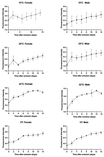 An increase in the pteridine content was observed over time following eclosion, as illustrated in Figure 7. Nevertheless, the pattern of this increase varied across different temperatures.