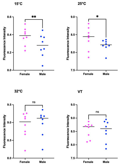 Comparison of the pteridine content of S. crassipalpis between females and males under different temperatures. The number of asterisks indicates the significant difference between different temperature groups. **: p < 0.01; *: p < 0.05; ns: not significant.