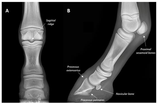 Radiographs of a fore digit showing the morphometric parameters in a T1 mule foal. (A) Dorsal-palmar view (lateral is to the left of image and medial is to the right). (B) Latero-medial view (dorsal is to the left of image and palmar is to the right).