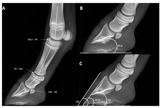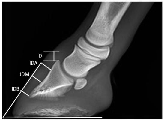 In addition, in radiographs where the angle between the vertical midline of the Mc3 and a perpendicular line to the ground floor was inferior to 15°, a series of 13 angular and linear direct radiometric parameters of the digit were evaluated [11] (Figure 2 and Figure 3). Angular parameters were as follows [11]: hoof angle (HA), dorsal distal angle of PD (DPDS), angle of solar aspect of PD (PA), proximal palmar compact bone angle (PCA), reflex angle of palmar compact bone (AA), distal apex angle PD (APPD), angle between Mc3 and PP (Mc3-PP), angle between PP and PM (PP-PM), and angle between PM and PD (PM-PD). Linear parameters were as follows [11]: founder distance (D), integument depth of the dorsal aspect of the foot, proximal site (IDA), integument depth of the dorsal aspect of the foot (mid-dorsal site) (IDM), integument depth of the dorsal aspect of the foot (distal site) (IDB).