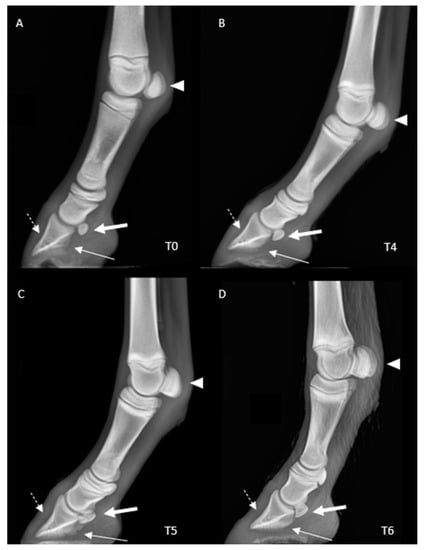 Chronological development of the morphological appearance of the fore digit in a mule foal: 24 h (T0) (A), 1 month (T4) (B), 2 months (T5) (C), and 3 months (T6) (D) after birth. Note: the PD is triangular to rounded at birth and flattens with growth (interrupted white arrow). The palmar processes start to develop by one month of life (white arrow); the navicular bone is round at birth and is increasingly developed (double white arrow). The proximal sesamoid bones develop from a single center of ossification and acquire a trapezoidal shape by 3 months of age (arrowhead). Key: PD: Distal Phalanx. Latero-medial views––dorsal is to the left.