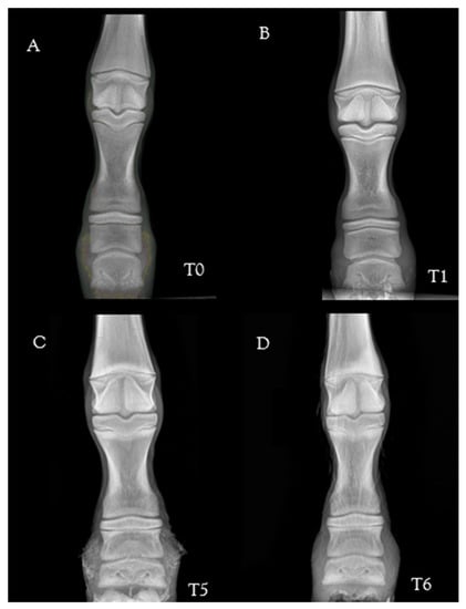 Radiographic examinations were performed on forelimbs every week for the first month of age and bi-monthly during the following two months for a total of six radiographic examinations, detailed as follows: T0 (within 24 h after birth), T1 (at 7 days of life), T2 (at 14 days of life), T3 (at 21 days of life), T4 (at 28 days of life), T5 (at 2 months of life), and T6 (at 3 months of life).
