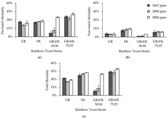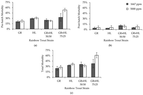 Pre-hatch mortality primarily differed by strain, although a formalin concentration by strain interaction also explained some of the variability in pre-hatch mortality (Table 6). The GR × HL 75:25 exhibited the highest egg mortality (43.0 ± 20.7%), with the second highest mortality observed in the HL strain (30.1 ± 1.5%), and lowest mortality observed in the GR strain (21.5 ± 1.9%) and GR × HL 50:50 (23.9 ± 1.8%). On average, mortality was higher when eggs were exposed to 5000 ppm formalin (32.4 ± 14.5%) compared to 1667 ppm formalin (26.8 ± 5.3%). The only strain to exhibit a sensitivity to formalin during the egg life stage was the GR × HL 75:25, with an increase in mortality of 20.8% between 1667 and 5000 ppm formalin (Figure 2). Post-hatch mortality differed by strain (Table 6), with the GR × HL 50:50 exhibiting the highest mortality, but mortality for all strains was ≤ 9.9 ± 1.7%.
