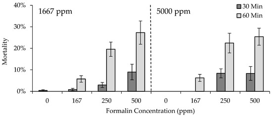 Average mortality (2SE bars) of rainbow trout (Oncorhynchus mykiss) exposed to either 1667 or 5000 ppm formalin as eggs (separated by vertical dotted line), and re-exposed to formalin as fingerlings at concentrations of 0, 167, 250, or 500 ppm for 30 or 60 min. Note that the mortality axis is reduced, to show differences among formalin concentrations and durations of exposure.