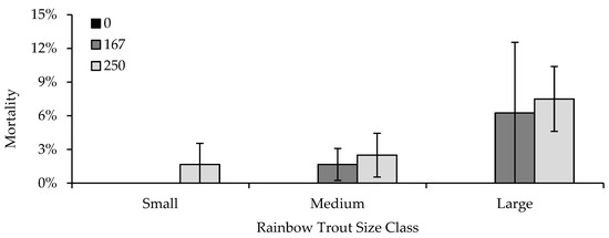 Average mortality (2SE bars) of small (38 mm total length [TL]), medium (77 mm TL) and large (128 mm TL) rainbow trout (Oncorhynchus mykiss) exposed to formalin concentrations of 0, 167, and 250 ppm. No mortality occurred when fish were exposed to 0 ppm (black bars) in any of the three size classes. Note that the mortality axis is reduced, to show differences among formalin concentrations and size.
