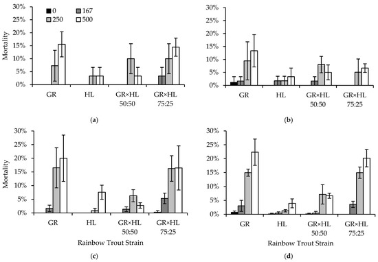 Density had a larger influence in experiment four, interacting with formalin concentration and strain to affect mortality of fingerling rainbow trout (Table 8). Mortality in the HL strain was generally lower than 5%, and the HL strain exhibited a sensitivity to formalin only in those tanks with a density index of ≥0.30. Neither the HL strain nor the GR × HL 50:50 exhibited an increase in mortality with an increase in tank density. The GR × HL 50:50 exhibited sensitivity to formalin when concentrations exceeded 250 ppm across all four densities; however, mortality was similar at 250 and 500 ppm formalin (Figure 5). The GR strain and GR × HL 75:25 exhibited sensitivity to formalin at all rearing densities, with higher mortality occurring at formalin concentrations of 250 and 500 ppm compared to 0 or 167 ppm. Additionally, especially for fish exposed to 250 or 500 ppm formalin, mortality for the GR and GR × HL 75:25 increased with an increase in tank density (Figure 5).