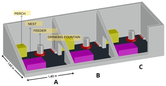 Six H&N Brown Nick layer hens, 35-weeks old at the beginning of the pilot experiment, were housed in an Environmental Preference Chamber (EPC) at the Faculty of Agricultural Engineering of the Campinas State University. The EPC comprises three mutually insulated compartments, measuring 1.6 m × 1.4 m × 3.0 m (L × W × H), enriched with a wood shavings bed (5 cm deep), a perch (60 cm length and 30 cm height), and a nest. The compartments are interconnected through automatic doors that allow the birds to move freely and choose their preferred environment, as shown in Figure 1. Before we initiated the experiments, the hens went through an adaptation period of seven days to gain familiarity with the EPC and learn to access its compartments.
