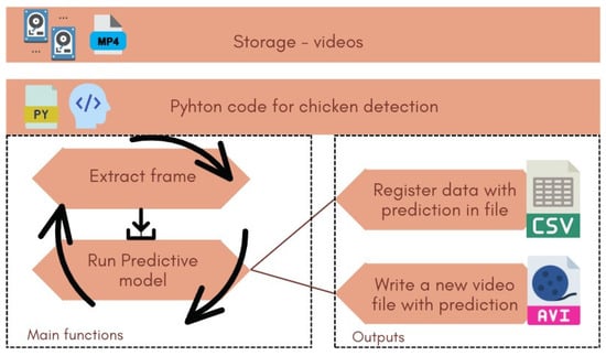 The workflow for our automatic chicken detection system is shown in Figure 2. A hard disk drive was used to store the videos in MP4 format. We developed a Python script to scan these video files and arrange them in a queue for further processing. A separate script corresponding to the bird detection model identifies the boundaries of birds as bounding boxes and calculates their centroids. After detection, the number of centroids present in each frame is stored in a structured CSV file, which also associates the results with the treatment information and respective EPC compartment.