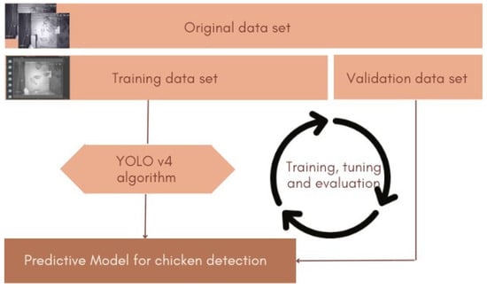 Our bird detection model is based on the YOLO (You Only Look Once) single-stage framework for object classification and detection [,,]. Unlike two-stage methods, in which image pixels are first coarsely segmented into regions of interest that are processed individually, the YOLO framework analyzes all the image pixels in a single step, which makes the model substantially faster than its two-stage counterparts. YOLO v4 [] is a recent variant of the YOLO framework. It detects objects of different sizes in low-resolution images with an accuracy comparable to that of most state-of-the-art object detectors in a fraction of the time required by these methods. In this work, we apply the methodology for bird detection using YOLO v4 described by Siriani et al. [], which follows the steps shown in Figure 3.