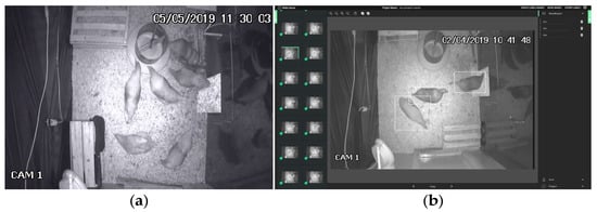 We selected 1041 random frames containing birds to compose our training dataset. Our validation dataset consisted of 200 additional frames selected at random from the original videos. Figure 4a shows one of the original frames from our training set. For both datasets, we use the MakeSense tool (www.makesense.ai, accessed on 10 March 2021) to delimit a rectangular region representing the space occupied by birds in the video frames and to manually annotate the bounding boxes corresponding to each bird, as illustrated in Figure 4b.