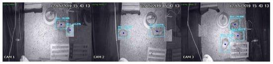 Sample frames simultaneously acquired from the three EPC compartments to manually validate the YOLO v4 detection model. The left and center frames illustrate the scenario where one bird can be partially observed in two compartments simultaneously.