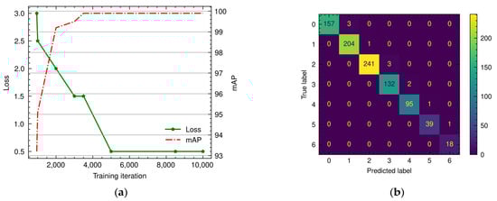 Figure 6a summarizes the performance of our detection model as a function of the training iterations on the 200 images composing our validation set. After approximately 5000 iterations, the loss value stabilizes at 0.5, and the mAP plateaus at ~99.9% after 3500 iterations. Although we cannot rule out model overfitting considering the similarity of the images in the training and validations sets, in this experimental environment this behavior is acceptable because all the frames used for the analysis were obtained under virtually identical conditions.