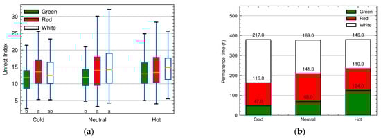 (a) Unrest index values for each combined temperature and illumination condition and Tukey statistical test result—the letters indicate significant difference (p < 0.05) in Tukey’s test between illumination treatments for each temperature condition. (b) Cumulative permanence time in hours for each combined light and temperature treatment.