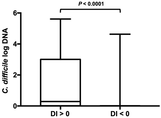 Dogs that tested positive for C. difficile had a significantly higher DI (median, 4.4 (range from −3.5 to 8.6)) than did dogs that tested negative for C. difficile (median, −1 (range from −7.2 to 8.9) (p < 0.0001) (Figure 1). Moreover, differences were observed in the groups’ abundance of detected C. difficile. C. difficile was found in greater abundance in dogs with a DI > 0 compared to dogs with a DI < 0 (p < 0.0001) (Figure 2).