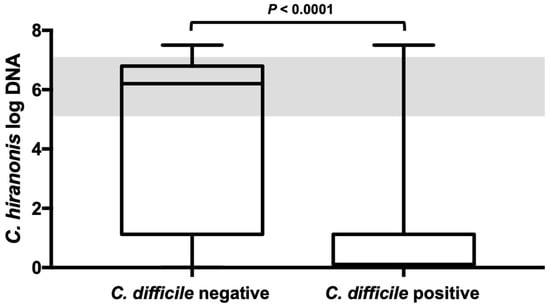 C. hiranonis abundance in dog fecal samples with and without C. difficile. Dogs tested positive for C. difficile had significantly lower abundances (logDNA/g) of C. hiranonis than did dogs that tested negative for C. difficile. The shaded area represents the reference interval. Minimum, maximum, and median are shown. Box and whisker plot showing minimum, maximum, median, and interquartile range are shown. Since the 25% percentile and median are equal in the right-sided plot they are not displayed as separate lines. Grey colored area represents the reference interval.