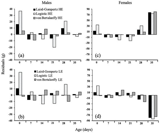 Similarly, at 14 and 21 d, all models underfit the response. The von Bertalanffy model was only −1 and −5 g, far from the response, while the Gompertz–Laird was −8 g at both ages and the logistic −19 and −22 g at both ages 14 and 21 g, respectively. In contrast, all models for the LE female group underfit the response. The von Bertalanffy model resulted in the lowest error at hatch and 7 d, while the logistic model was more accurate from 14 to 28 d but presented the highest error at 35 d.