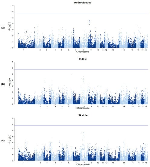Genome-wide association plots for androstenone (a), indole (b), and skatole (c) concentrations. The horizontal line identifies the genome-wide significance threshold (−log10 (0.05/m), with m as the total number of markers).