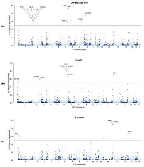 Percentage of genetic variance explained by SNP windows for androstenone (a), indole (b), and skatole (c) concentrations. Each dot represents one SNP window of 0.4 Mb. The horizontal line identifies the threshold of 0.5% used to select SNPs for candidate gene search.