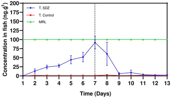 The results showed that during the exposure phase, the concentration of SDZ increased in the fish tissues over time, reaching a peak on day 7 at a concentration of 91.72 ng·g−1. After two days of the depletion phase (7–9 days) the organisms had eliminated 93.12% of the accumulated SDZ, and at the end of the experiment the concentration was 0.83 ng·g−1. It was observed that during the exposure and elimination phase, the concentration was below the MRLs (100 ng·g−1).