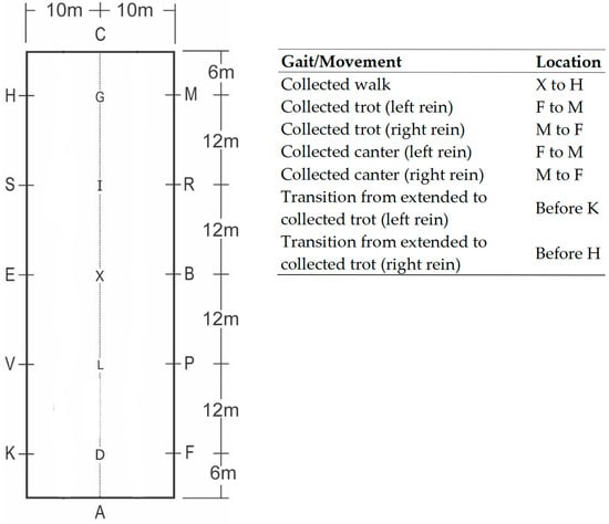 Riders wore riding breeches, boots, a tightly fitted shirt, and a helmet. After warming up, each horse–rider dyad performed a dressage test (Supplementary File S1) written for this study (HMC) to evaluate specific aspects of horse and rider performance. The tests were performed in a 20 m × 60 m arena (Figure 1) with sand and geotextile/fiber footing. The gaits analyzed were collected walk on a straight line, collected trot and collected canter on straight lines on the left and right reins, and transitions from extended to collected trots on straight lines on left and right reins. During postprocessing, the gaits and movements of interest were identified via visual examination of the video footage, and the video time codes were used to select the time-synchronized segments of IMU data for analysis. For the steady-state gaits, nine strides were selected from the mid-section of the IMU data string to omit turning effects.