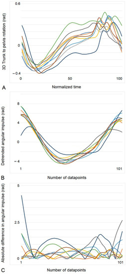 The rotation of the trunk relative to the pelvis was calculated for each orthogonal rotation and the 3D resultant determined, as outlined previously for horse back 3D rotation. Each gait sequence was separated into strides (9 strides) and time-normalized to 101 points. These data were exported to Excel. The ensemble mean of the 909 points was calculated, and this value was subtracted from each individual data point to center the data set around zero. For each stride, the 3D resultant rotations between the trunk and pelvis were summed to obtain the angular impulse. Each individual trial was then detrended via subtracting the linear trend from the waveform. Finally, the absolute difference between each data point and their averages across the nine trials were calculated. To compare between riders, the average deviation in detrended angular impulse over the nine trials was calculated (DVar), which was the summed absolute difference of all the data points divided by the number of data points [35,36]. An example of the results of performing these calculations is shown in Figure 2.