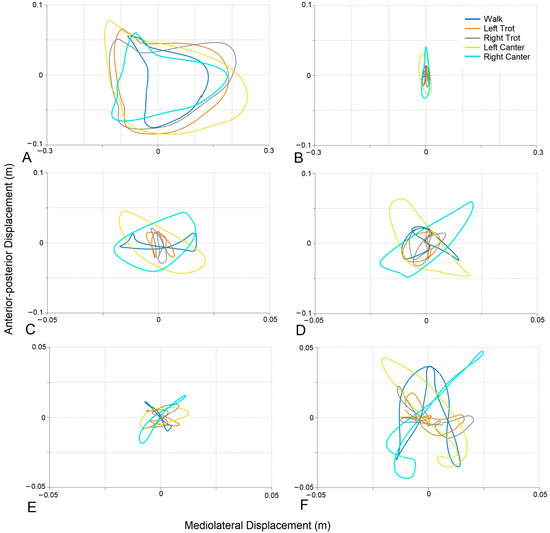 Examples of average transverse-plane motions (m) on the left from a Small Tour rider riding a Small Tour horse (average scores: gait = 6.3; general impression = 6.6) (A,C,E) and, on the right, from a higher-scoring GP rider riding a GP horse (average scores: gait = 7.7; general impression = 7.6) (B,D,F) over 9 strides of steady-state gait in a straight line. (A,B) Trunk displacement. (C,D) Pelvis displacement. (E,F) Horse back displacement. Walk = blue; left trot = orange; right trot = grey; left canter = yellow; right canter = cyan.