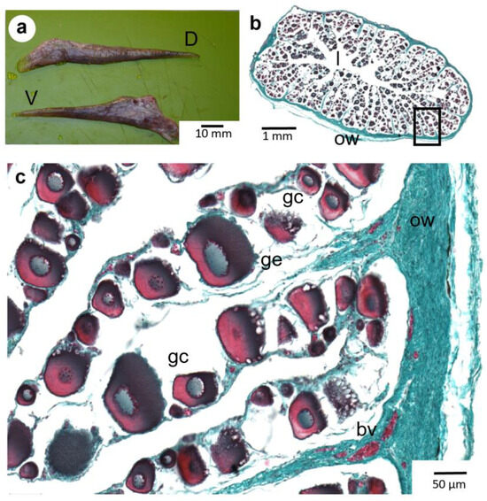 Ovaries appeared as paired, elongated structures within the abdominal cavity (Figure 2a). The gonadal section presents a concentric organization of the folded germinal epithelium that constitutes the ovarian lamellae, connecting to the external ovarian wall. This germinal epithelium contains the oogonia, oocytes, and/or follicles, depending on the stages of gametogenesis, until the release of mature oocytes from their follicles into the ovarian cavity just before spawning (Figure 2b,c).