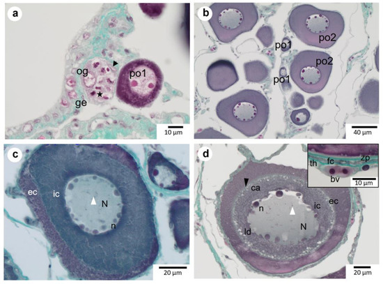 Oogonia, primary growth oocytes, and early vitellogenic oocytes (vit1) of P. platessa. (a): Oogonia (og) associated with somatic cells (black arrow) nested in germinative epithelium (ge). Note an oogonia nest with intense proliferative activity (★). (b): An early primary oocyte (po1) with a low number of nucleoli and highly stained cytoplasm and more advanced primary oocytes (po2) with abundant nucleoli (n) along the periphery of the nucleus (N). The nuclear membrane is still smooth. (c): Precortical alveoli stage, classified under po2, with cleaved ic and ec (internal and external cytoplasm, respectively). Lampbrush chromosomes (the white arrowhead) may be observed. (d): Cortical alveoli oocytes (cao) with a scalloped nuclear membrane. Lipidic droplets (ld) are observed in the inner cytoplasm. Cortical alveoli (ca) can be seen along the junction between the inner and outer cytoplasms. The follicle envelope is composed of a thin zona pellucida (zp) encompassed between the oocyte membrane and the complex follicular cells (fc) and theca (th) containing blood vessels (bv).