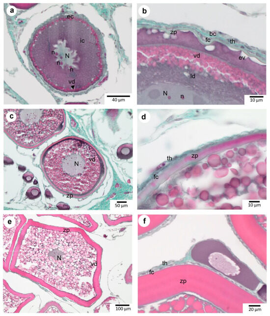 Vitellogenic oocytes of P. platessa. (a,b): Early vitellogenesis in vit1 oocytes, showing the formation of pink-stained eosinophilic vitellus droplets (vd and black arrow), initiates the start of vitellogenesis. At this stage, vitellus droplets coexist with scarce lipidic droplets (ld). The cytoplasm is zonated (ic and ec for internal and external cytoplasm, respectively). The zona pellucida (zp) is still thin and basophilic. Endocytosis vesicles (ev) are clearly visible under the zona pellucida. The follicular cells (fc) and the theca (th) containing blood vessels (bv) encircle the oocyte. (c,d): Mid vitellogenic oocyte (vit2) showing progressive invasion of the cytoplasm by vitellus droplets. The zp progressively thickens and becomes eosinophilic. (e,f): Late vitellogenic oocyte (vit3) with the thickening of the zp fully red and vitellus droplets filling the entirety of the cytoplasm. N: nucleus; n: nucleolus.