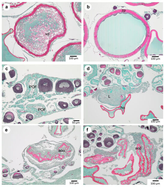 At the end of vitellogenesis, the oocytes (vit3) (Figure 4e) are completely filled with vitellus droplets. The follicles appear polygonal in shape, surrounded by a thick and fully eosinophilic zona pellucida (53.81 μm ± 5.10 μm). Vitellogenic oocyte vit3 size reaches 629.5 µm (±88.5 µm).