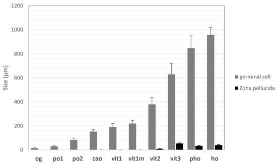 At the end of the hydration process, hydrated oocytes appear spherical (Figure 5b). A fully hydrated oocyte (ho) possesses a homogeneous cytoplasm with no visible vitellus droplets. The mean diameter of ho is 958.7 μm (±60.7 μm), while zona pellucida thickness reaches 40.4 μm (±5.0 μm). Figure 6 illustrates female germinal cells’ growth diameter from the oogonia stage to mature oocytes. Moreover, zona pellucida thickness increases mainly between vit2 and vit3 stages. The presence of follicle cells and theca indicates that the oocyte has not been emitted yet. The observation of well-preserved, hydrated oocytes is tricky due to the difficulty of cutting at this stage.