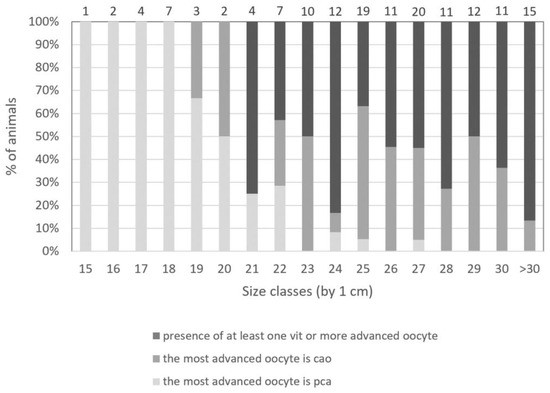 Through this method, Figure 7 shows for fish of each size class the percentage of animals classified into the most advanced oocyte stage present within the ovary. When taking into account precortical alveoli oocytes (i.e., og, po1, or po2) as the most advanced follicle stage, all individuals of 18 cm or less are classified into that category. The first individual with cao as the most advanced oocyte stage appears at 19 cm (n = 1 out of 3 sampled individuals). Individuals presenting vitellogenesis (i.e., vit1 and later stages) as the most advanced oocyte stage are 21 cm and over.