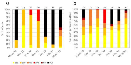 Figure 8a shows the percentage of mature individuals with their most advanced germline stage, classified by month over a year (March 2018 to March 2019). All individuals (n = 123) are ≥21 cm long and could be considered sexually mature when looking at Figure 7. The first sampling in March 2018 showed a majority (80%) of individuals presenting POF, an indication of spawning. In June, 58% of individuals showed pca as their most advanced oocyte stage, while the rest showed cao, indicating that spawning events ended between March and June. From November to December, the number of individuals with partially hydrated oocytes at the most advanced stage increases. In January and February, the majority of individuals (70% and 91%, respectively) presented POF, signaling that spawning has occurred. By March 2019, individuals with POF were still present (46%), but there are still individuals with pca (3%), cao (27%), vitellogenic oocytes (17%), and ho (7%) as their most advanced oocyte stage, indicating oogenesis onset.