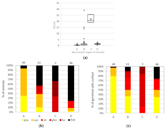 The gonadosomatic index (GSI) was established for each individual classified under a visually determined maturity stage A, B, C, or D (Figure 9a and Table 1) for all sampled animals (n = 151). The mean GSI shows the highest rates (22%) for individuals classified under C (spawning) (n = 3) and the lowest mean GSI (<1%) for phase A (immature) (n = 49). When using quantitative data issued from stereologic analysis (Figure 9b,c), immature A animals were mainly associated with pca or cao as the most advanced stage (94%), whereas 6% of them exhibited POF, attesting that they had already spawned. On a stereological level, however, POF represented only about 2% of the total germ cell surface. For developing animals (B) (n = 53), approximately 43% had POF as the most advanced stage, even if they represented only 9% of the total germ cell surface. For spawning animals (C), 66% have ho or POF as the most advanced stage. Maturity phase A shows a majority of pca stages (80%), but the presence of cao (17%), ho (<1%), and POF (2%) underlines misclassifications. This problem is also found in phase B, with 76% of germ cells that are of vit stage and under, but pho (12%), ho (3%), and POF (9%) are present. Phase C shows a majority of pho (70%), with no cao stage or below, but the presence of vit (14%), ho (15%), and a few POF (1%). Finally, for phase D, all germ cell types are present, with the highest mean surface percentage for pca (34%), followed by POF (25%), and vit (22%).