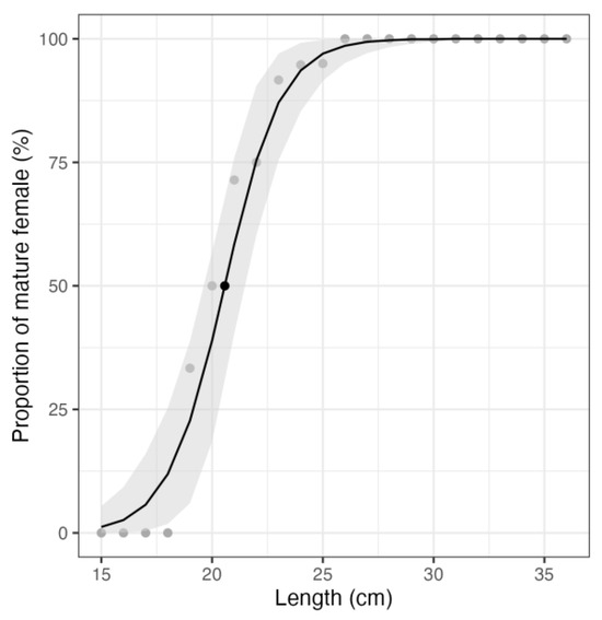 Logistic regression between the size (x-axis) and the proportion of mature females in the sampling (y-axis). The gray dots are the individual measurements, the black dot is the L50 (20.6 cm), and the gray ribbon displays the estimates’ confidence interval using a non-parametric bootstrap with 1000 replications. The confidence interval of L50 is [19.6, 21.5] cm.